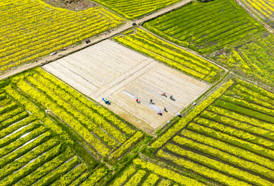3月19日,在湖南省婁底市雙峰縣井字鎮白碧村一處早稻集中育秧點,農民在秧田里勞作(無人機照片)。新華社發(李建新攝)