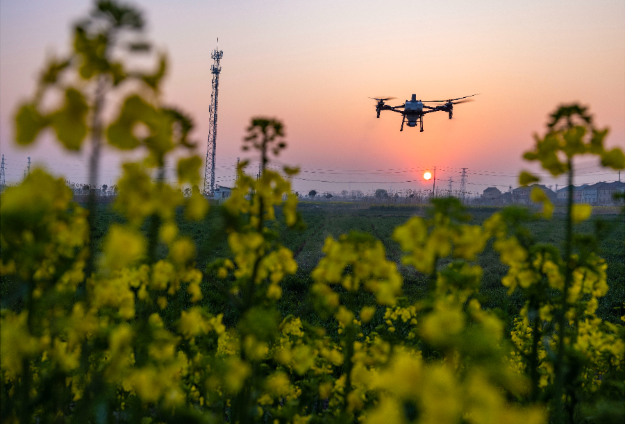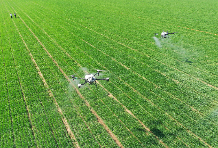 3月20日,在江蘇省泰州市海陵區蘇陳鎮徐莊村,農技人員操作無人機進行小麥春管作業。新華社發(湯德宏攝)