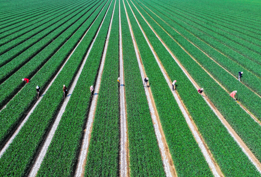 4月20日,在山東省東營市廣饒縣李鵲鎮拐子村的田地里,農民在為覆膜的春玉米打孔(無人機照片)。新華社發(劉雲傑攝)