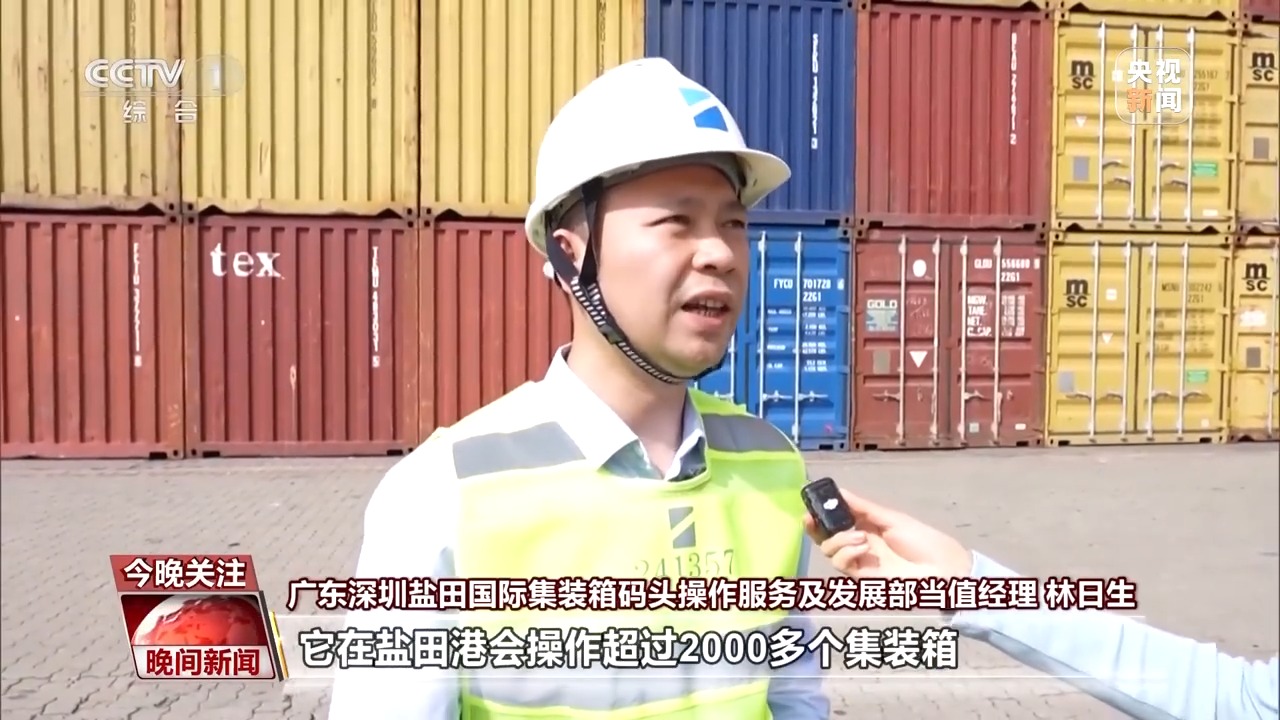鹽田國際集裝箱碼頭操作服務及發展部當值經理 林日生:這是去往美國的一艘船,它在鹽田港會操作超過2000多個集裝箱。其他船公司全部都在協調碼頭來調靠泊位,碼頭每天都有6班船舶去往美國。