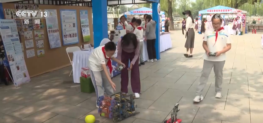 “科技強國”小學生社團風採展示活動也在現場同步開展。來自北京各個學校的少先隊科技社團齊聚一堂,孩子們興致盎然地分享自己設計拼裝的投球機器人、巡防機器人、智能消毒碗櫃等精彩紛呈的科技成果。