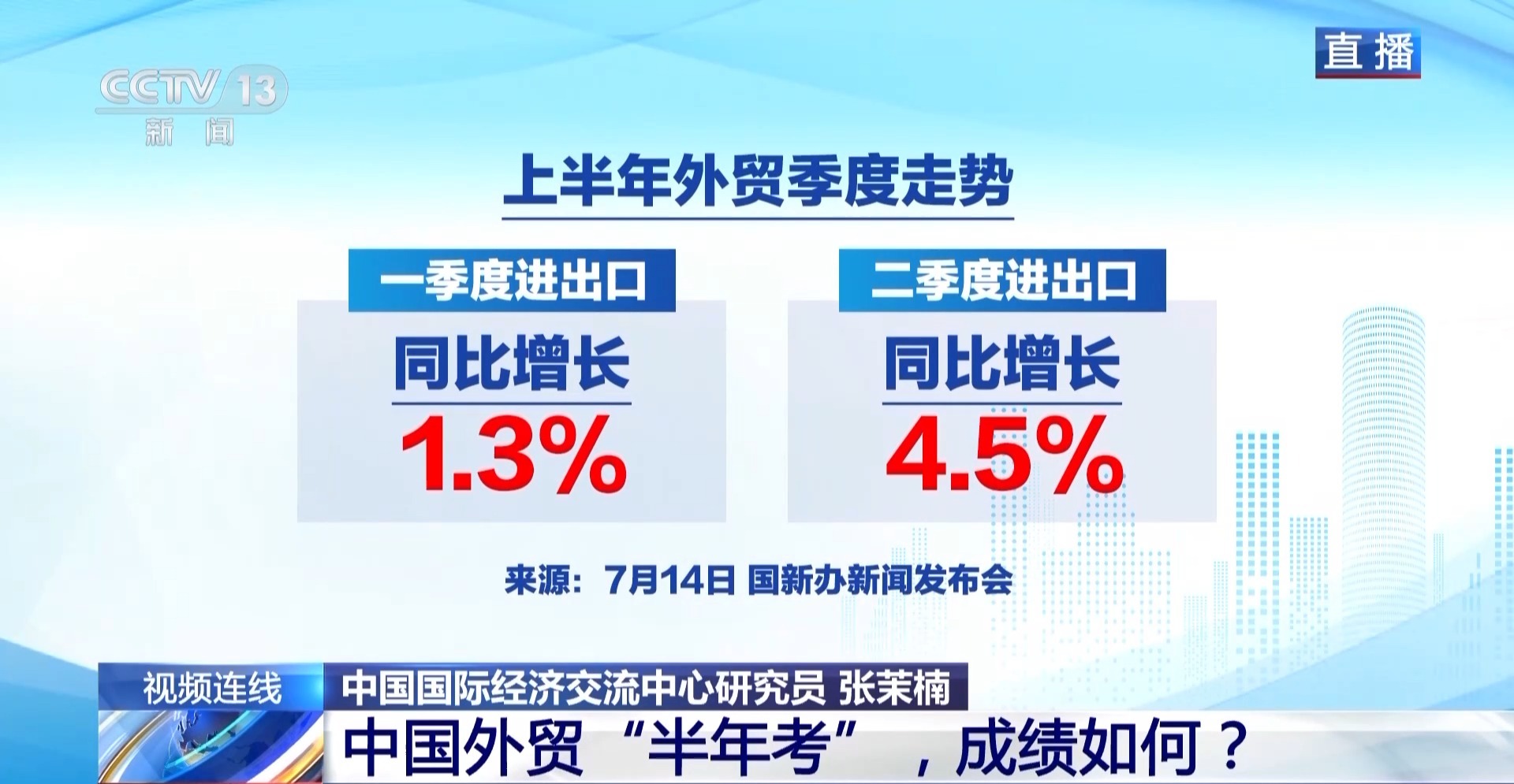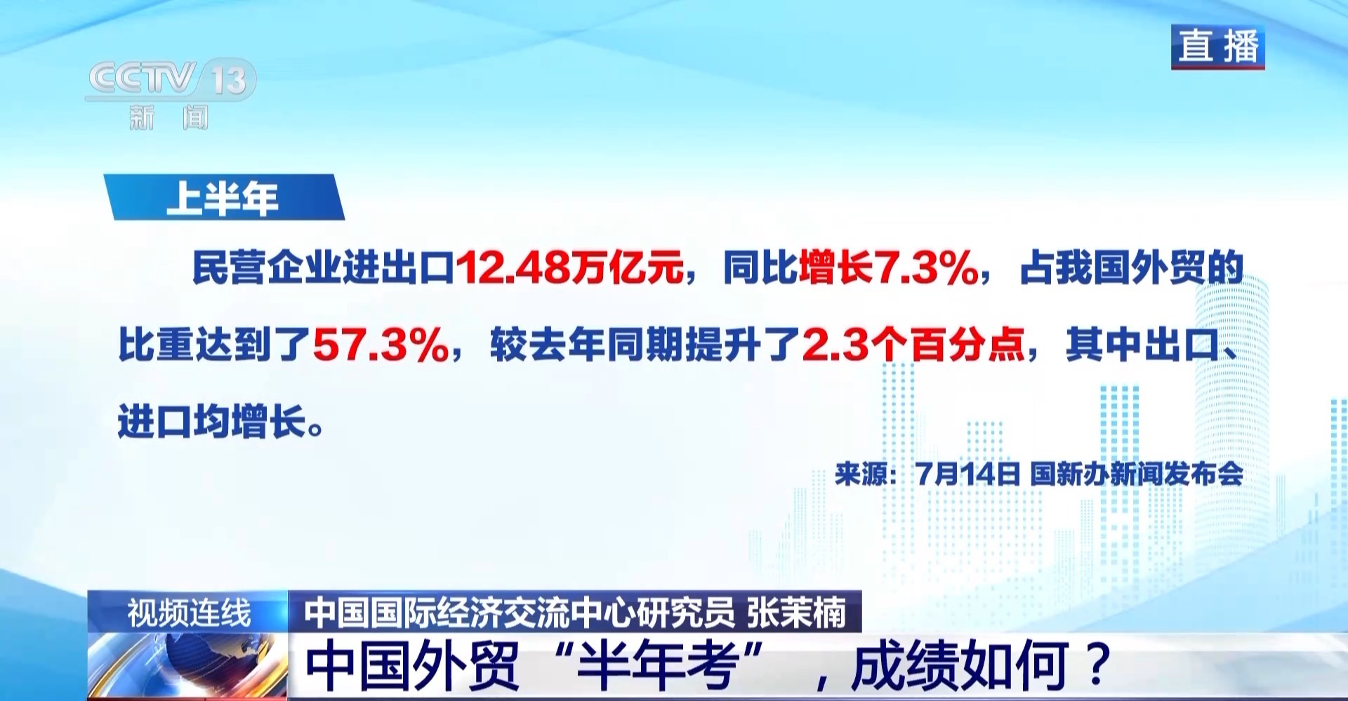 中國國際經濟交流中心研究員 張茉楠:整體看今年上半年的外貿成績確實超乎預期,經歷外部的不確定性,包括貿易摩擦,以及貿易保護主義所帶來的衝擊之下所取得的成績。總體來講可以用價增質優來形容,尤其是對于整體的貿易結構而言,可以說交出了一份比較滿意的答卷。