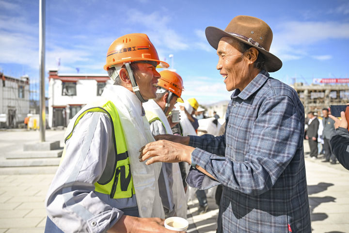 機器的轟鳴聲與悠揚的藏民族歌曲交織在一起,村民們依次向援建者獻上潔白的哈達、斟滿飄香的酥油茶,還有村民用大拇指蘸著白色的糌粑在他們身上點個指印,宛如一個個真誠的“點讚”,場景溫暖感人。