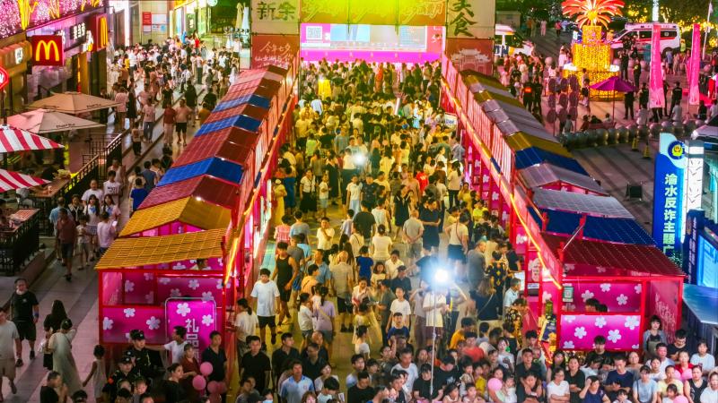 步入流光溢彩的消費市集,這里有非遺區、農特文創區、美食區等多個板塊,商家們在這里充分展示本地特色產品、文旅資源與七夕文化元素,此起彼伏的叫賣聲與美食香味交織。市集旁七夕情歌大舞臺傳來的動人歌聲,勾勒出一幅充滿煙火氣的夏夜景象。作為消費月活動亮點,花車巡遊每周五、周六下午5時30分準時啟程,從恆太城出發,途經贛西民宿風情街,抵達抱石公園。每到一站,“七仙女”翩然降臨,帶來精彩快閃舞蹈,並向觀眾派發文創小禮品,引發陣陣熱潮。風情街的王老板笑逐顏開:“(有花車巡遊時)人流量是平時的三倍!感謝‘仙女’們給我帶一波流量!”截至8月27日,七夕消費月帶動參與商戶總支付2559.22萬元,帶動參與商戶總核銷1656.67萬元,生動體現了“浪漫經濟”的強勁發展動能。