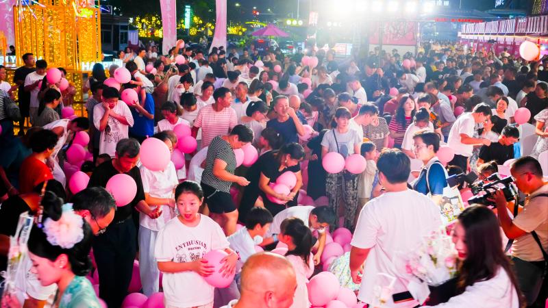 8月1日晚,新余最繁華的恆太城廣場華燈璀璨,2000只粉色氣球如瀑布般傾瀉而下,在市民如潮的歡呼聲中,“為愛甄選”活動率先引爆現場氣氛。節慶的歡騰轉化為消費的熱力。市民和遊客在“踩氣球尋寶”的遊戲中收獲驚喜——獎品包含仙女湖景區門票、文創禮品、民宿折扣券等“寶藏禮券”。“我今天搶到3張券。”市民錢小小興奮地展示著自己的收獲。
