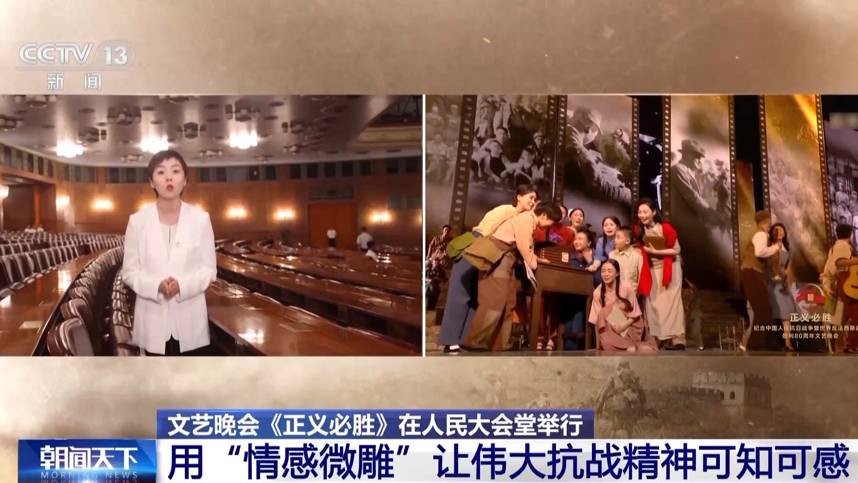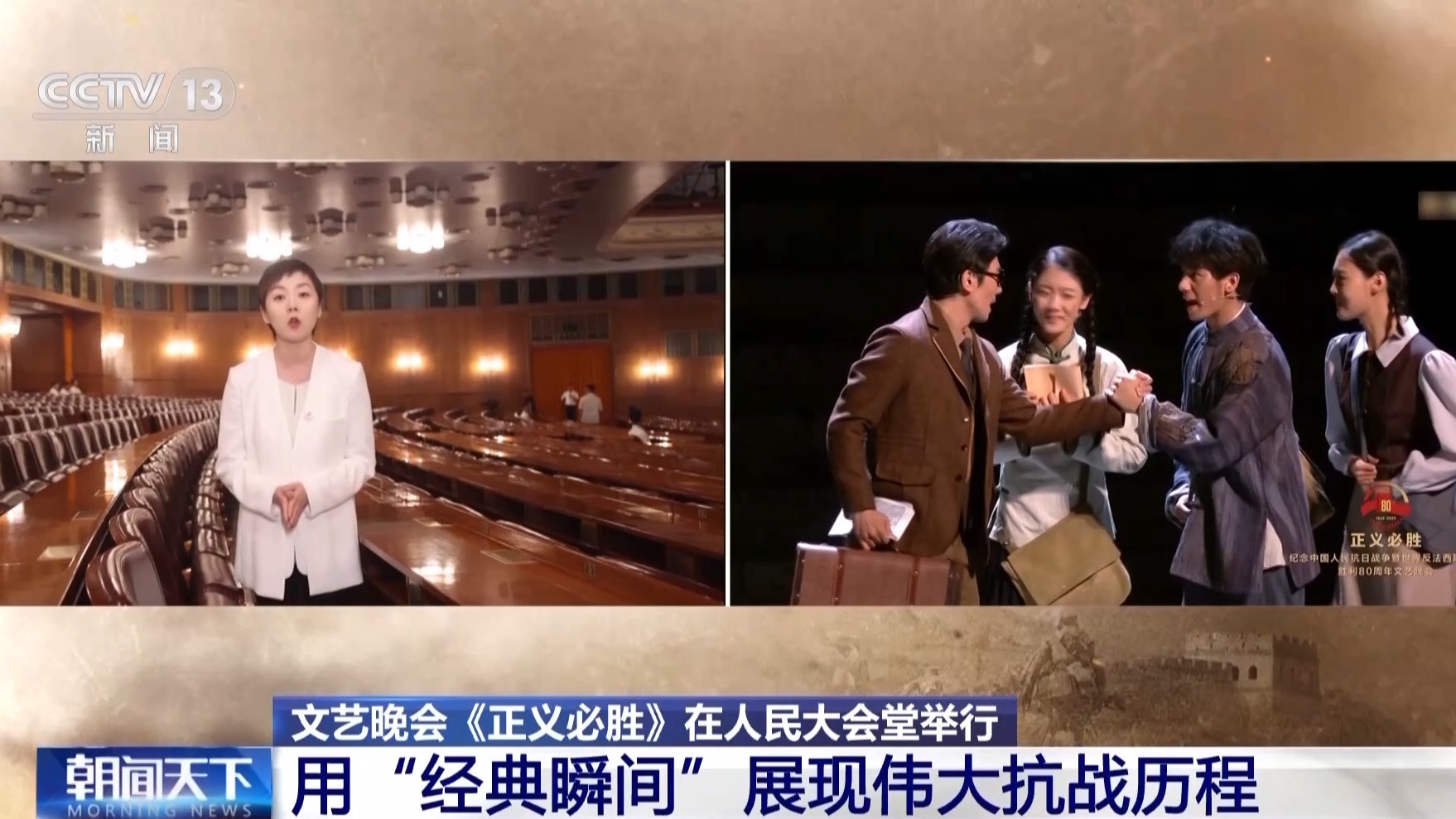 3日晚,紀念中國人民抗日戰爭暨世界反法西斯戰爭勝利80周年文藝晚會《正義必勝》在人民大會堂舉行。