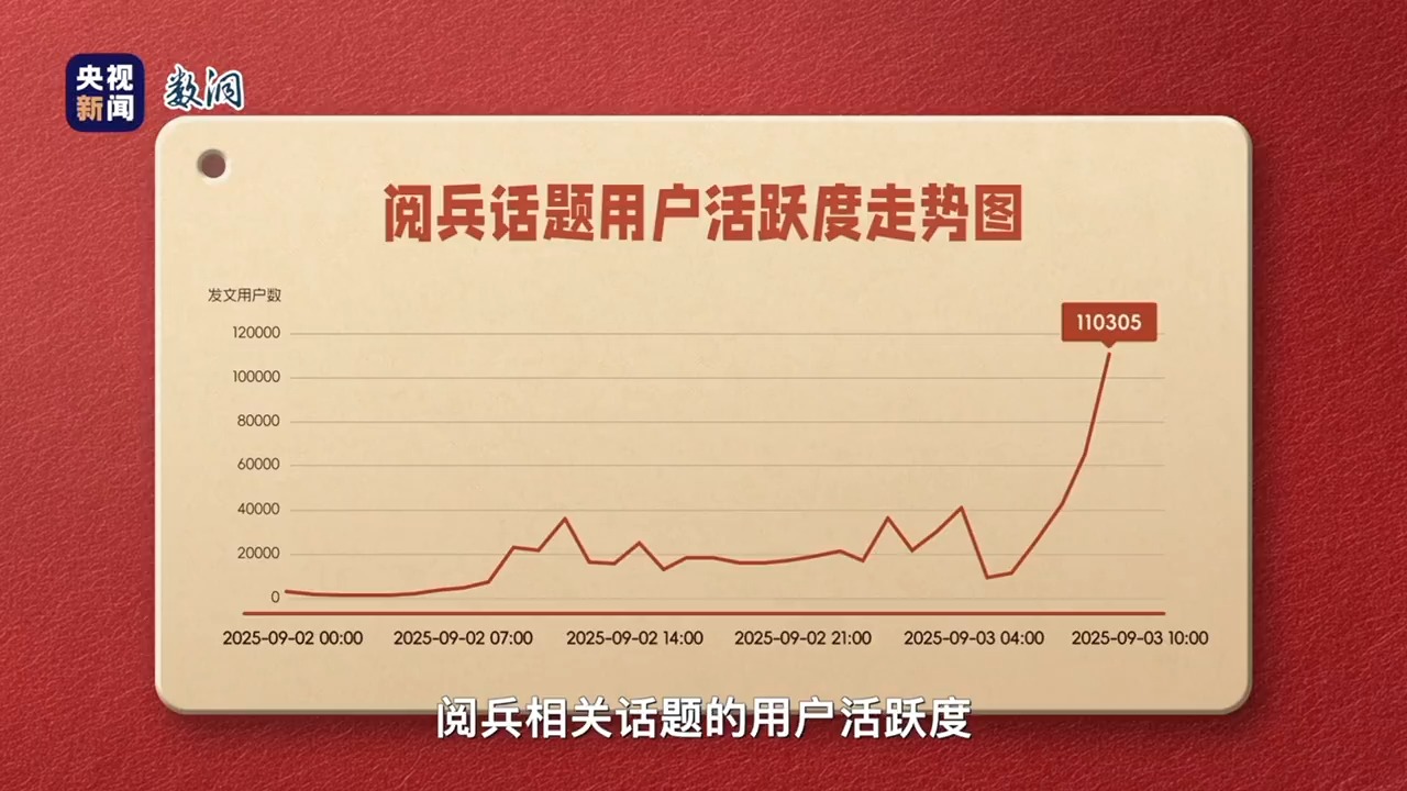 數據曲線和觀眾的情緒重疊上揚,開始的瞬間,閱兵相關話題的用戶活躍度飆升到前一天最高值的三倍。