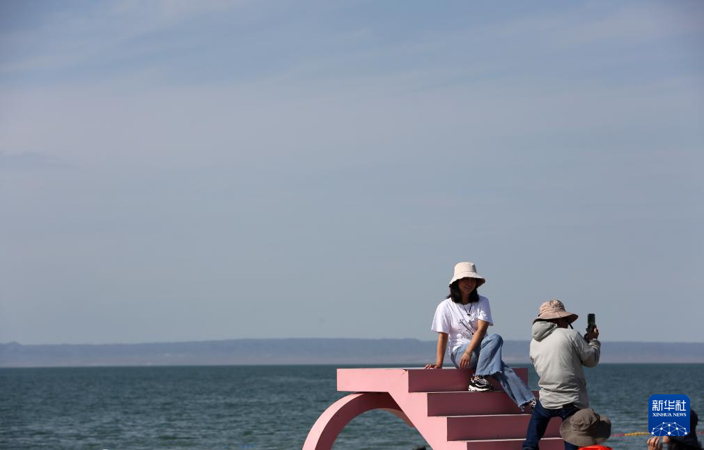 9月8日,遊客在新疆阿勒泰地區福海縣烏倫古湖金沙灘景區拍照。