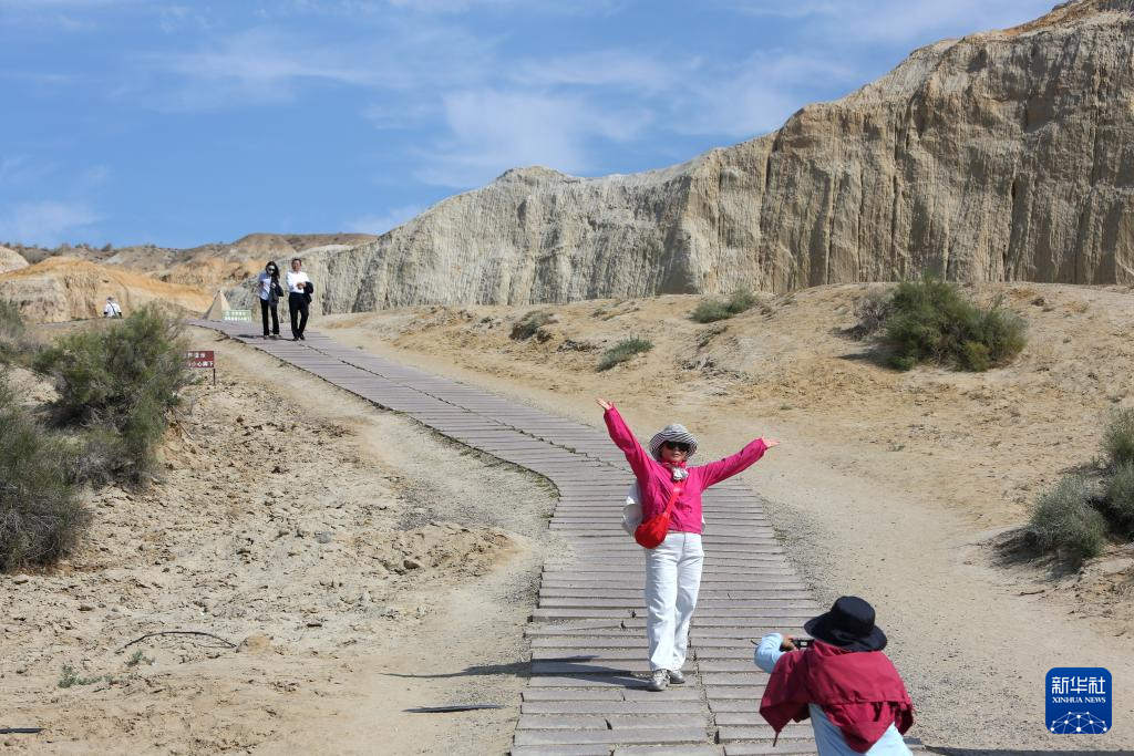 9月8日,遊客在新疆阿勒泰地區福海縣烏倫古湖海上魔鬼城景區遊玩。