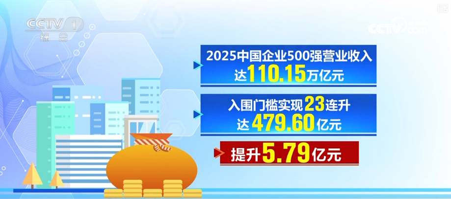 2025中國企業500強營業收入達110.15萬億元,入圍門檻實現23連升,達479.60億元,提升5.79億元;實現歸屬母公司所有者凈利潤總額4.71萬億元,增長4.39%。