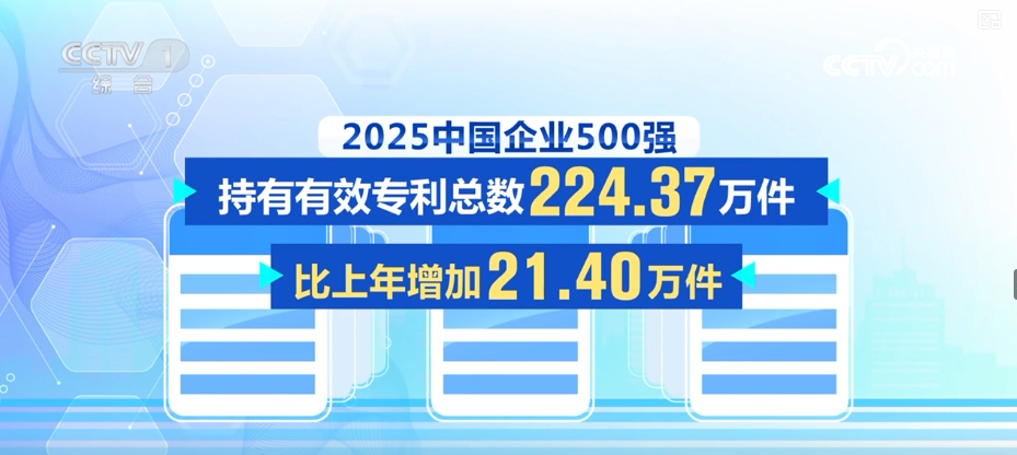 2025中國企業500強持有有效專利總數224.37萬件,比上年增加了21.40萬件。其中,發明專利佔全部專利的46.33%,發明專利數量連續6年保持增長,比上年提高了2.50個百分點,專利質量明顯提升。