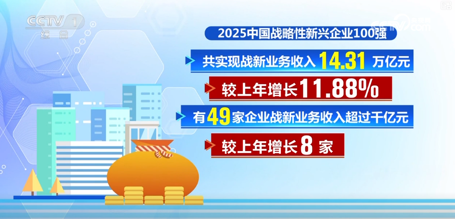 此次同步發布的中國企業500強榜單還包括戰略性新興產業100強等一係列專項榜單。2025中國戰略性新興企業100強,共實現戰新業務收入14.31萬億元,較上年增長11.88%。有49家企業戰新業務收入超過千億元,較上年增長8家。