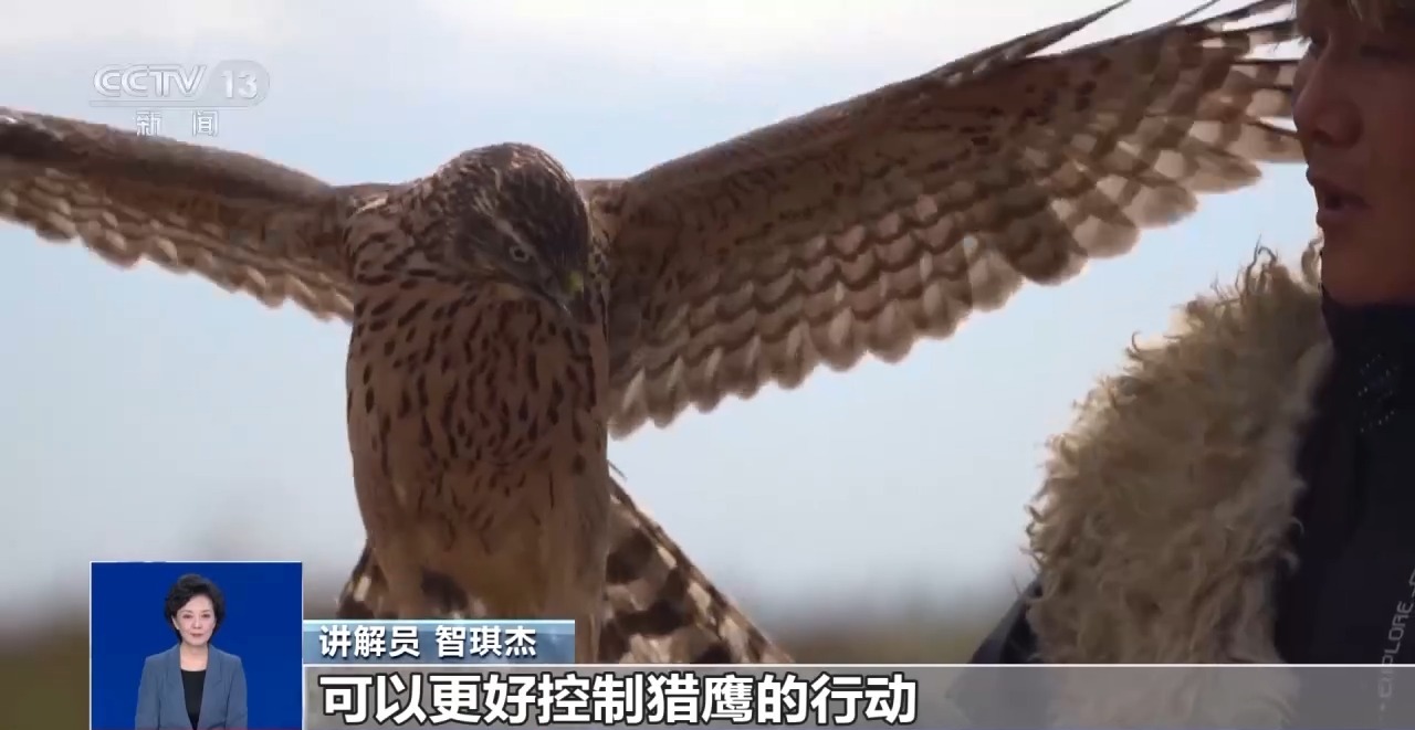 講解員 智琪傑:鷹尾鈴挂在鷹尾巴上,會發出叮叮當當的響聲,便于獵戶知道它的去向。鷹絆繩是馴鷹專用繩,可以很好地控制獵鷹的行動。