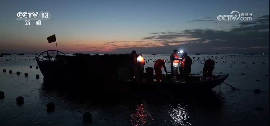 海面上,漁民的頭燈在微亮的天色下閃爍格外醒目。大家各自忙活著,有的在收鮑魚,有的在給鮑魚投喂龍須菜。隨著天色漸亮,滿載鮑魚的運輸船陸續靠岸,新鮮鮑魚被轉運到車間進行分揀,然後送往市場銷售。