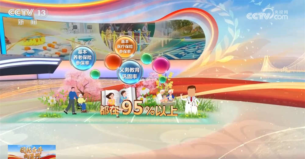 這五年,經濟發展、科技進步的成果實打實地轉化為群眾的獲得感和幸福感。我國已建成全球規模最大的教育體係、社會保障體係、醫療衛生體係,義務教育鞏固率和基本養老保險、基本醫療保險參保率都在95%以上。
