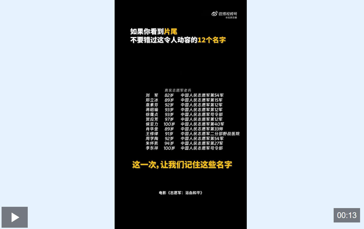 在影片結尾,銀幕上緩緩浮現12個名字,他們是真實的志願軍老兵,每一位都已經超過80歲,多數在90歲以上,更有幾位已是百歲老人。