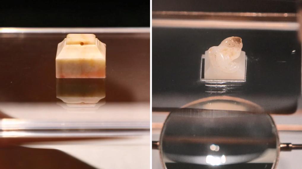 拼版圖片:左圖為西漢“趙徜”覆鬥紐玉印(復制品),右圖為“劉賀”螭紐玉印。新華社記者 袁慧晶 攝