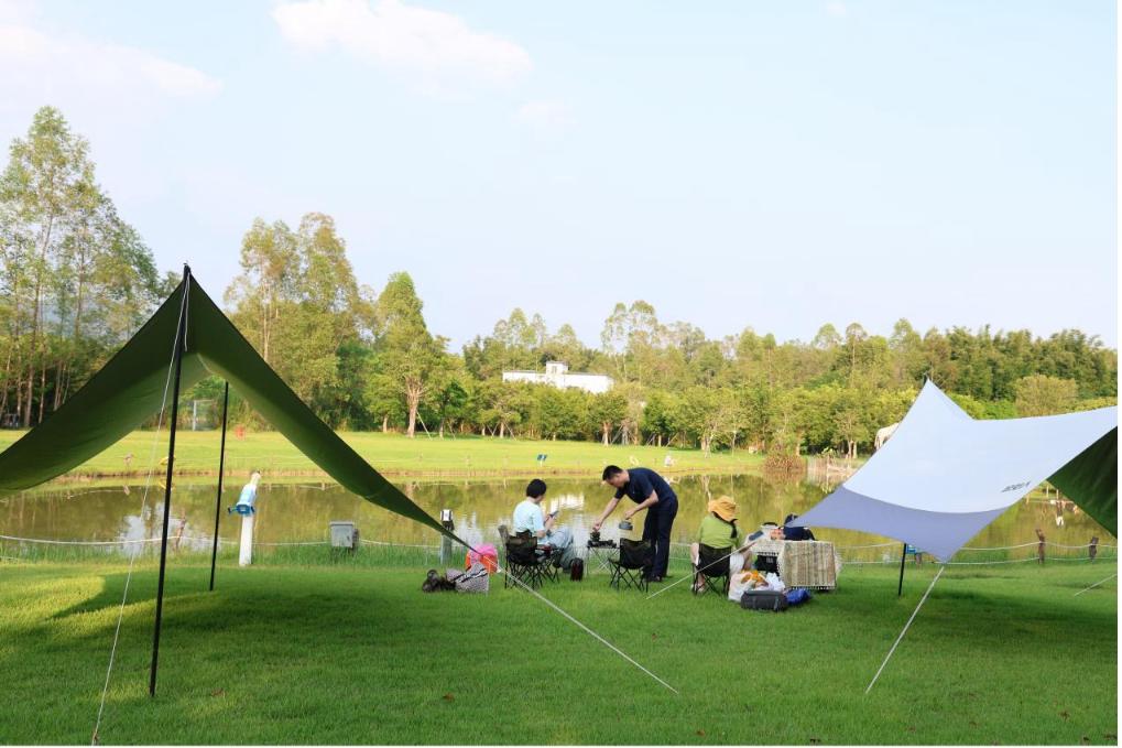 國慶中秋假期,廣州的遊客在天幕旁享受露營時光。新華社記者鐘焯 攝