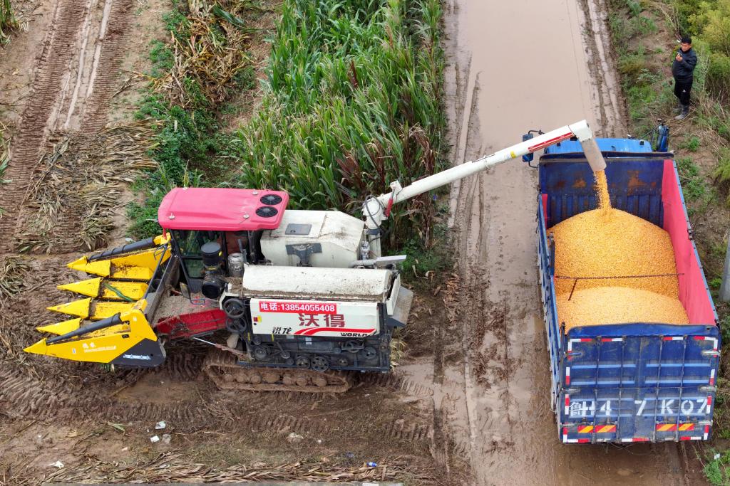 2025年10月11日,在安徽省淮北市濉溪縣百善鎮張莊村,從河南駐馬店調運過來的履帶式收割機在收割玉米。新華社發(徐弘揚 攝)