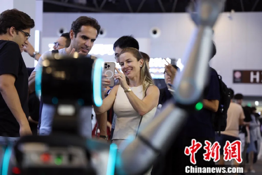 2025年7月,在上海舉辦的2025世界人工智能大會上,一款中國制造的機器人吸引外國觀眾。中新社記者 湯彥俊 攝