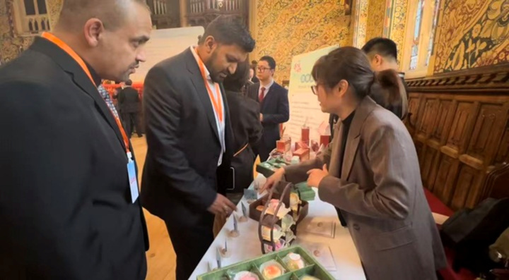 南京中醫藥大學帶來的則是中醫藥文化和江蘇非遺的碰撞。該校黨委宣傳部副部長劉丹青介紹,這次帶來的金陵非遺藥膳茶點靈感來自藥食同源的中國飲食文化,印刷體驗也是將中醫藥經典古籍和來自揚州的國家級非物質文化遺產雕版印刷技藝做了結合。“希望大家能在濃濃中國味道、書香氣息中感受到中醫藥文化‘融入生命生活’的獨特魅力。”曼徹斯特議員Naila Sharif 親手制作了中醫養生學專著《尊生要旨》中的“八段錦導引圖”書葉,“太美了,這簡直是Art(藝術)!”,她連連稱讚並表示要帶回家中珍藏。