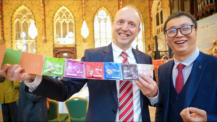 曼徹斯特大學教授John Haskell在現場饒有興致地品嘗由無錫市中醫醫院帶來的各類中藥茶飲,無錫市中醫醫院副主任中醫師彭健耐心地解釋著每一種茶飲的功效。在看到由新華日報社健康傳媒中心與江蘇省海濱康復醫院聯名打造的“好好喝茶”六連包養生茶時,John Haskell跟著彭健一字一句地讀出“爺們兒茶”,引得在場觀眾笑出聲來。