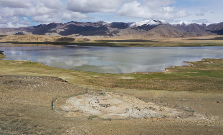 這是2025年5月22日拍攝的坐落在瑪不錯湖畔的遺址第四期石構地面建築考古發掘現場(無人機照片)。新華社記者 李賀 攝