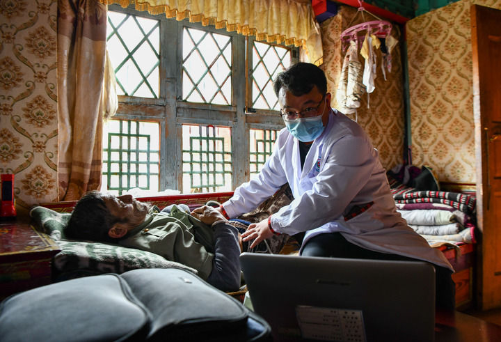 2023年6月12日,廣東珠海市人民醫院第七批援藏醫療隊王旭彤醫生在給西藏米林市吞不絨村患者珠傑檢查身體。新華社記者 晉美多吉 攝