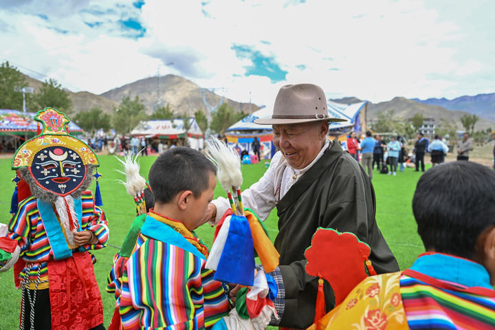 2025年7月16日,76歲的湘巴藏戲國家級非遺傳承人次仁多吉(右二)在西藏南木林縣非遺公園內給即將表演湘巴藏戲的小演員整理服裝。新華社記者 李鑫 攝
