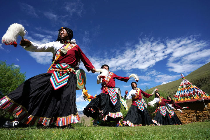 2020年7月1日,在西藏山南市瓊結縣,久河村卓舞隊的隊員在表演國家級非遺項目“久河卓舞”。新華社記者 詹彥 攝