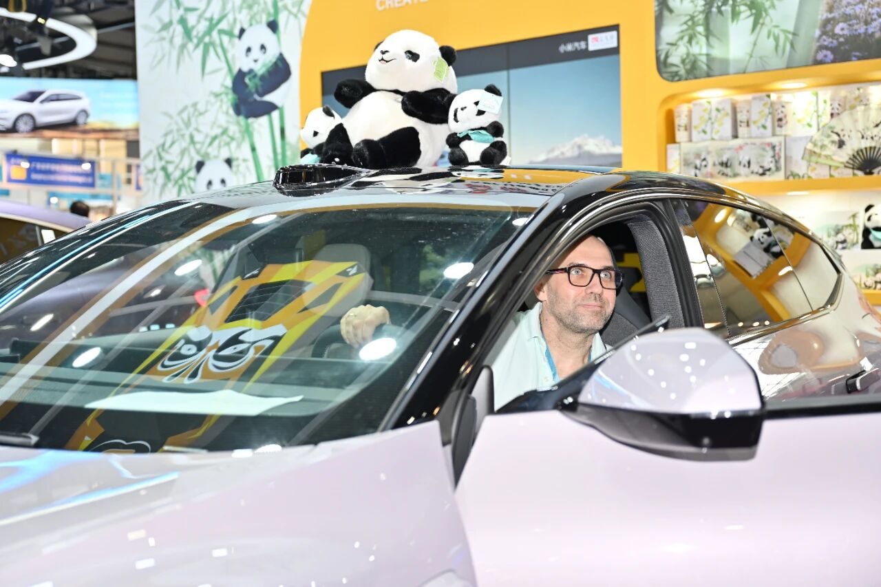 2025年10月16日,第138屆廣交會展出的新能源汽車吸引境外採購商參觀體驗。中新社記者 陳楚紅 攝