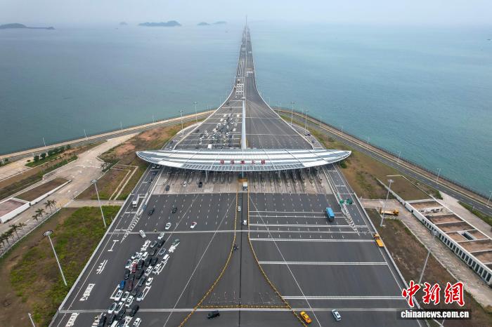 2024年3月30日,廣東珠海,港澳車輛經港珠澳大橋珠海公路口岸入境。(無人機照片) 中新社記者 陳驥旻 攝