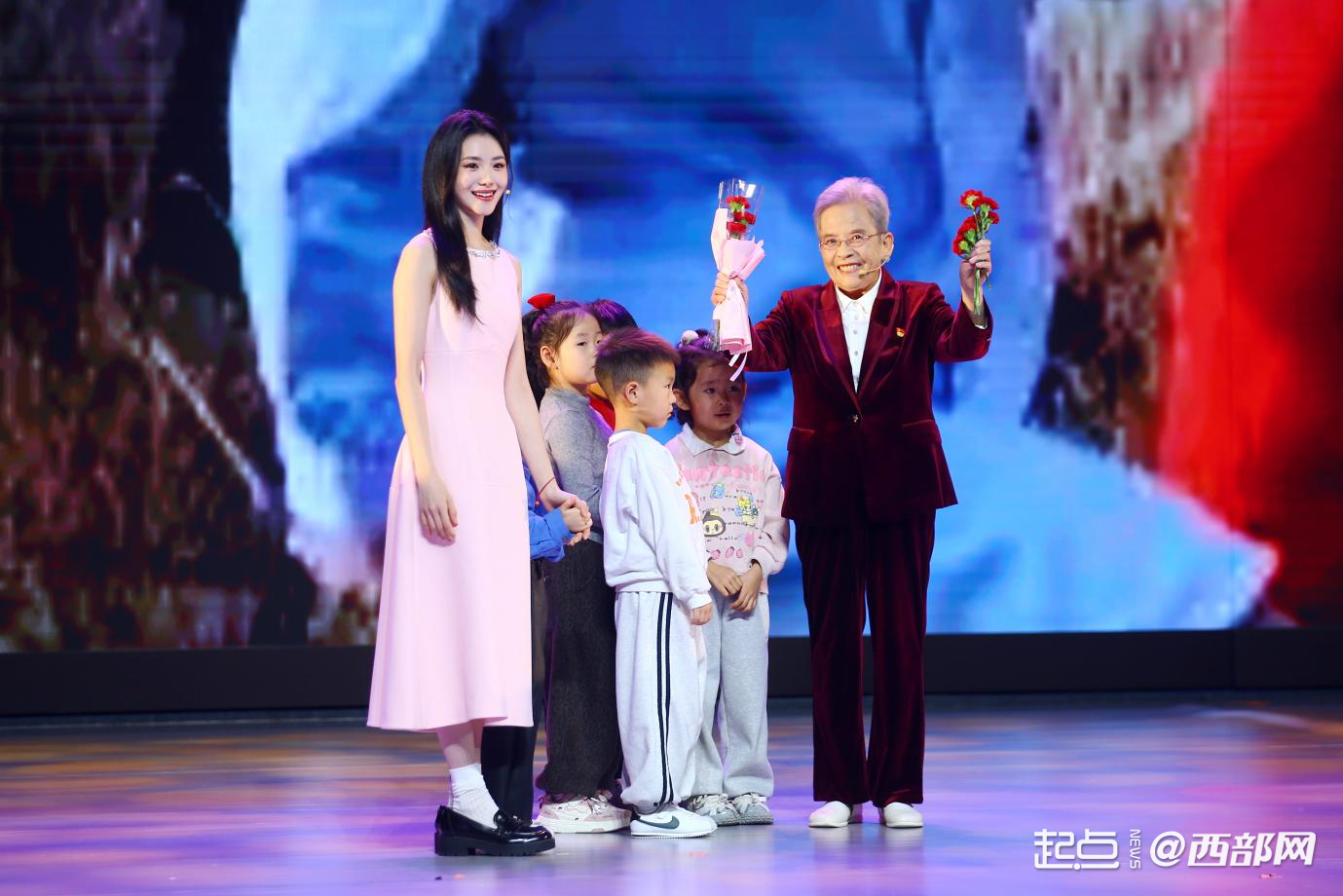 啟動儀式現場,演員劉浩存牽著小朋友們為路生梅送上鮮花。