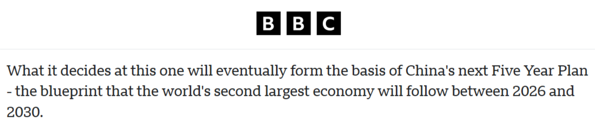 10月20日至23日,黨的二十屆四中全會在北京舉行。對此,英國廣播公司(BBC)19日報道認為,“此次會議所作的決定最終將成為中國下一個五年規劃的基礎,而這一規劃將指引世界第二大經濟體在2026年至2030年期間的發展方向”。