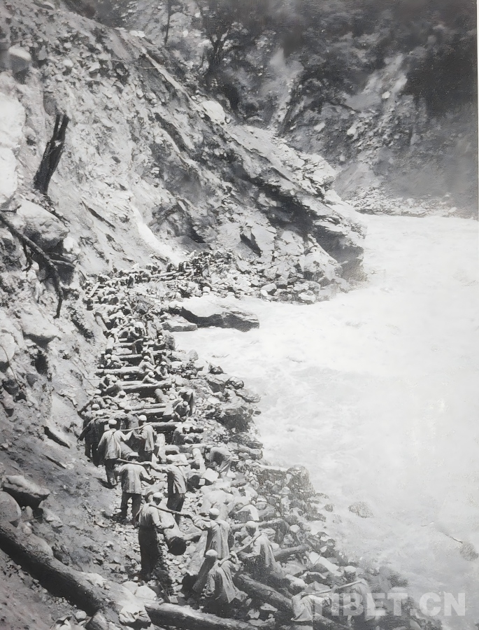 圖為上世紀50年代初,康藏公路扎木路段(位于今波密與魯朗之間)的築路現場 作者供圖