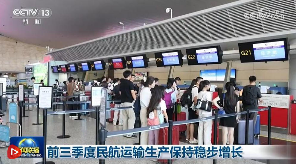 央視網消息(新聞聯播):記者從民航局了解到,今年前三季度民航運輸生產保持穩步增長。全行業完成運輸總周轉量、旅客運輸量、貨郵運輸量同比分別增長10.3%、5.2%和14%。