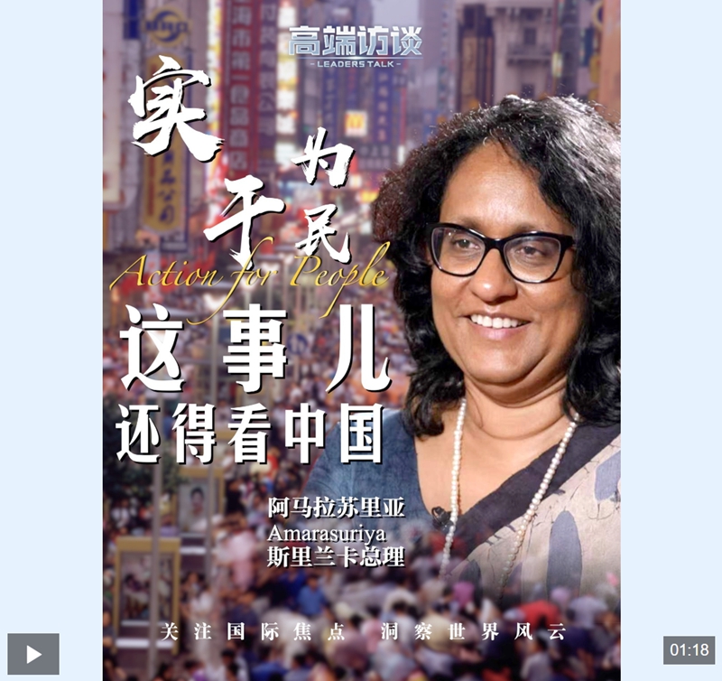 斯里蘭卡總理阿馬拉蘇里亞日前接受總臺《高端訪談》欄目專訪。她點讚中國發展奇跡,直言從中國學到“擔當、紀律、為民”三大啟示,其中“為民”是核心,人民生活的切實改善就是中國發展奇跡的最好證明!