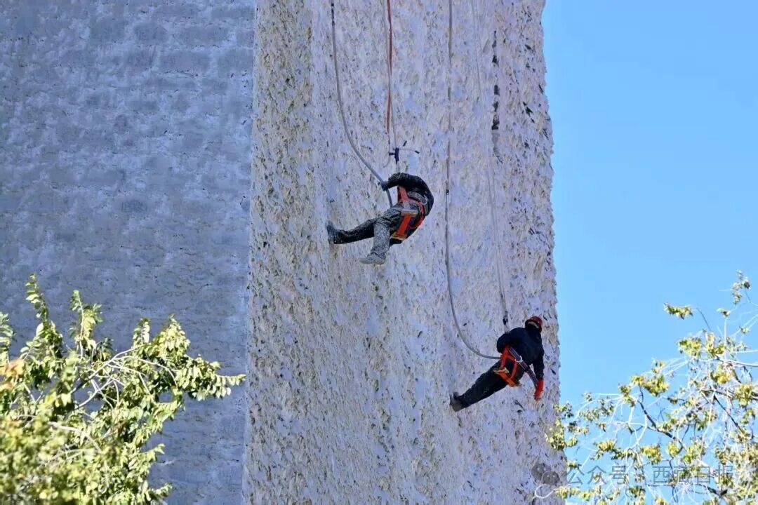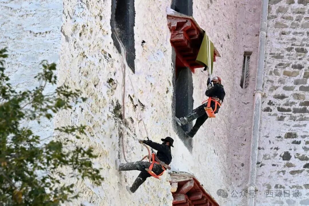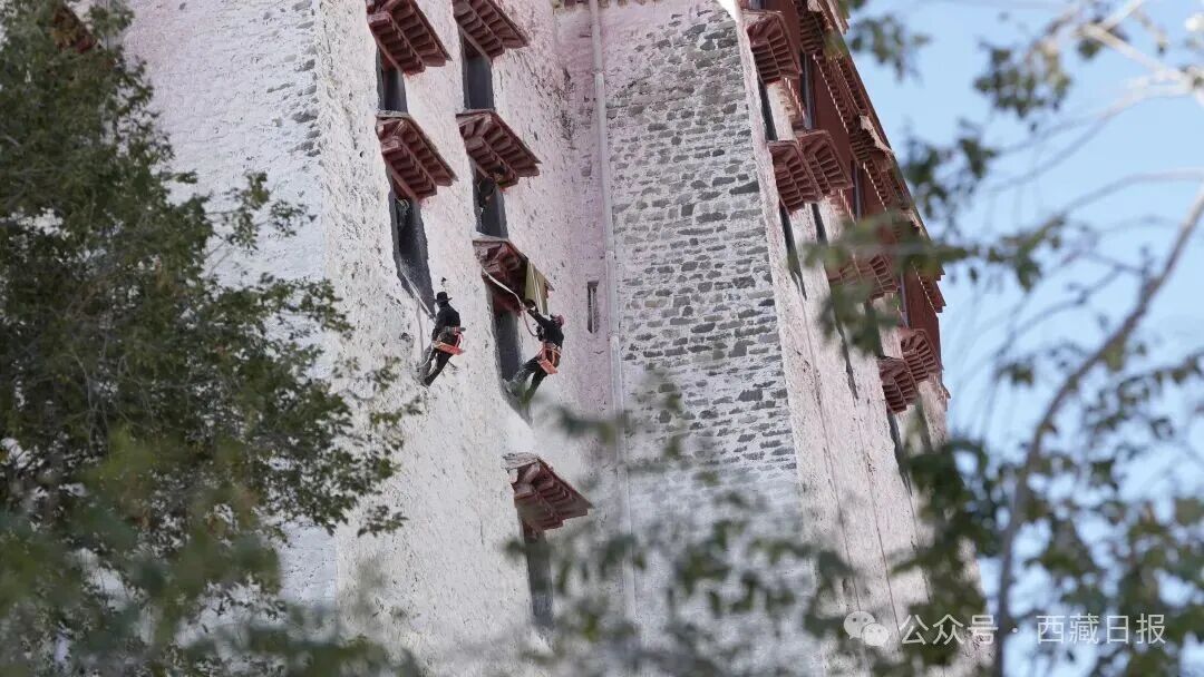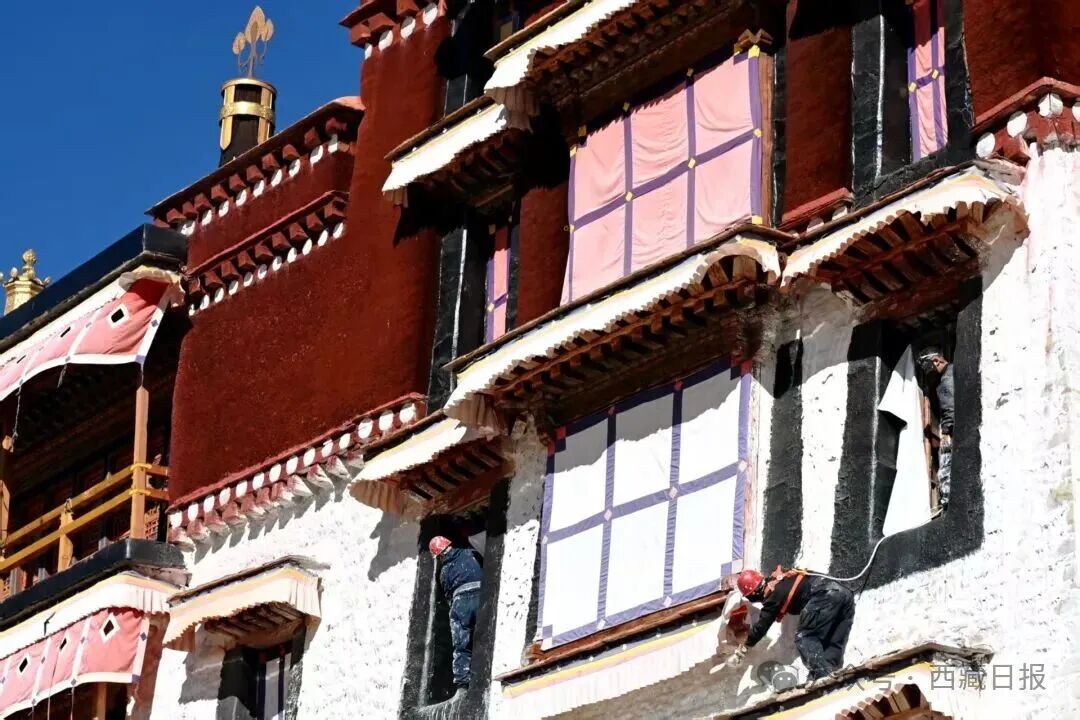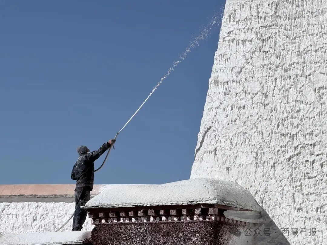 在布宮後方的陰涼處,來自拉薩的阿旺拿著對講機正在指揮運送涂料的人,他說:“我每年都會來,以前需要半個月左右,現在隨著攪拌、噴涂設備越來越好,人員分工組織越來越規范,粉刷只需要一周左右。”