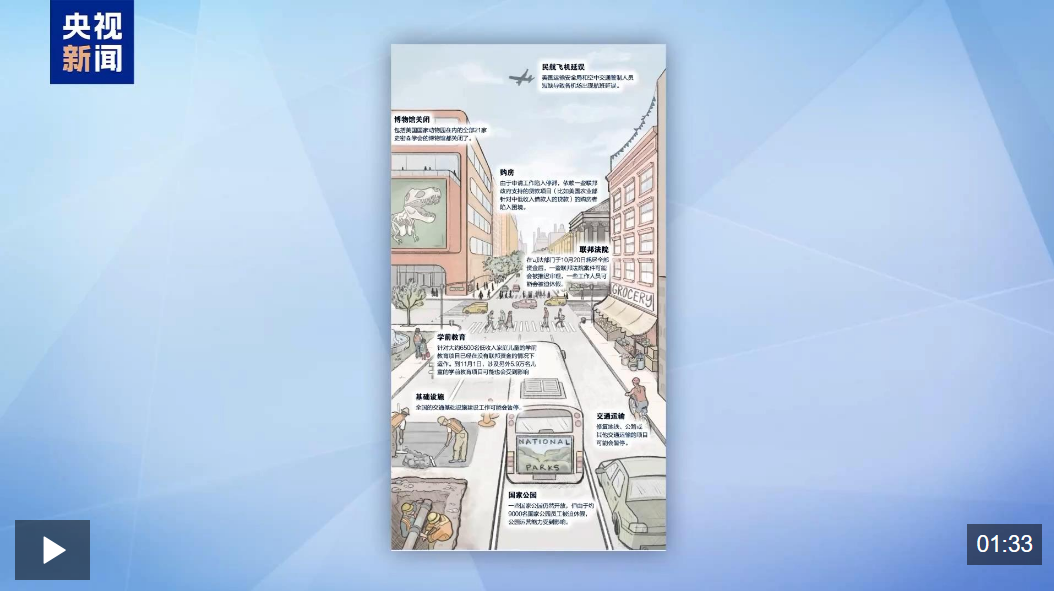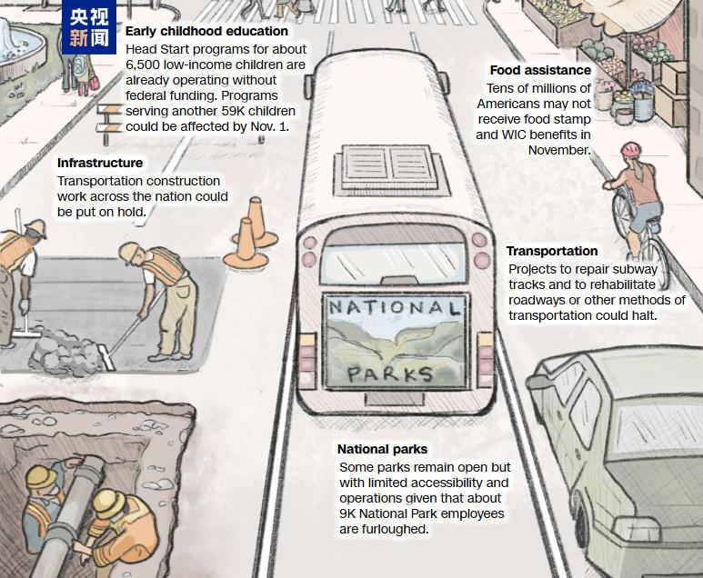 數以千萬計的美國人11月可能無法領取食品券和婦女、嬰兒和兒童特別營養補充計劃的福利;美國全國的交通基礎設施建設工作可能會暫停;修復地鐵、公路或其他交通運輸的項目可能會暫停; 一些國家公園仍然開放,但由于約9000名國家公園員工被迫休假,公園運營能力受到影響。