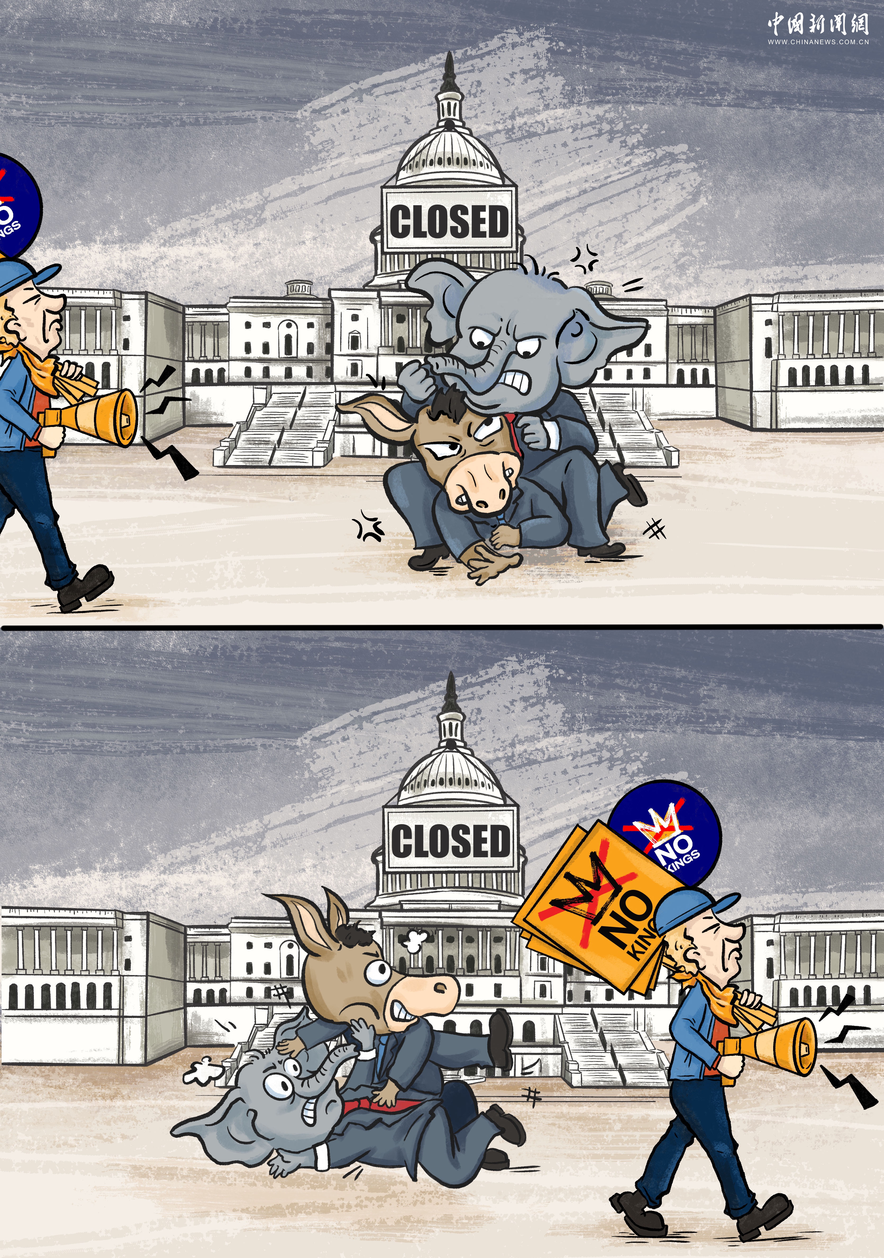 當舉著“No Kings”標語的民眾漠然路過時,爭鬥中的驢與象似乎才短暫地停下,驚覺真正的議題早已不是彼此間的勝負——而是那扇高懸著“關門”牌子、對沸騰民意關閉的聯邦政府大門。