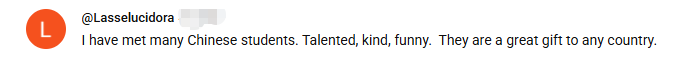 網友@Lasselucidora表示:“我見過很多中國學生。他們才華橫溢、善良又風趣。他們對任何國家來說都是一份珍貴的禮物。”