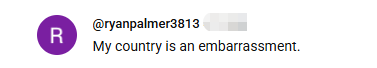 美國網友@ryanpalmer3813感慨道:“我的國家真讓人尷尬……”