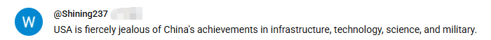 網友@Shining237認為:“美國嫉妒中國在基礎設施、技術、科學和軍事方面取得的成就。”