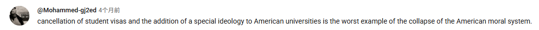 網友@Mohammed-gj2ed指出,取消學生簽證、在美國大學里加入特殊的意識形態,這是美國道德體係崩潰的最壞例子。