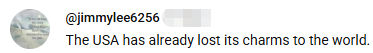 網友@jimmylee6256說道:“美國已經失去了對世界的魅力。”
