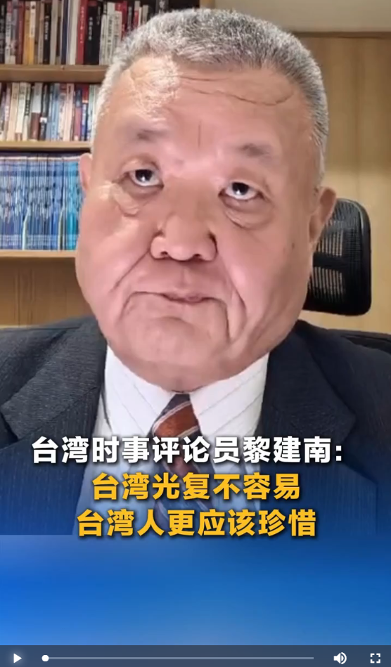 臺灣時事評論員黎建南接受中新網視頻採訪時表示,臺灣光復是抗戰勝利的重要成果。“所以,我們在紀念抗戰勝利時,就一定要紀念臺灣光復。我們緬懷歷史,也要吸取教訓,要牢記臺灣光復不容易,臺灣人更應該珍惜。”(採訪 燕新臺 制作 林可)