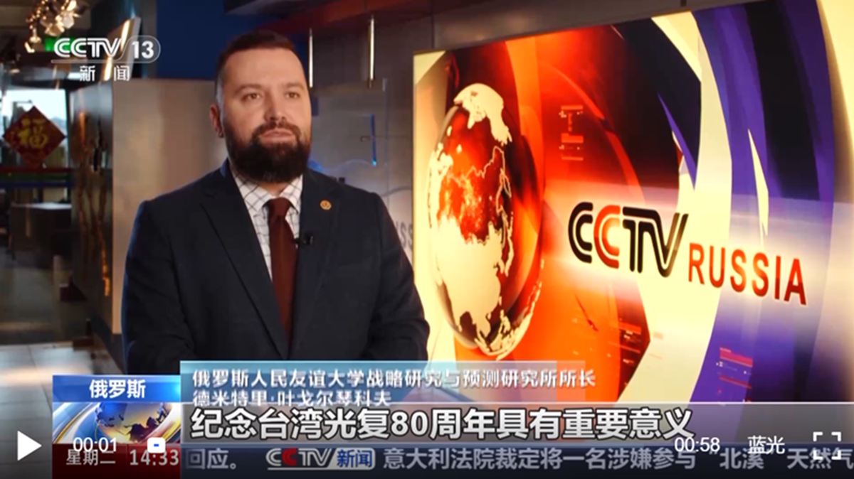 俄羅斯人民友誼大學戰略研究與預測研究所所長 德米特里·葉戈爾琴科夫:紀念臺灣光復80周年具有重要意義,象徵著中國人民心向統一。戰勝日本軍國主義是世界反法西斯戰爭的重要組成部分,這一歷史應該被銘記。