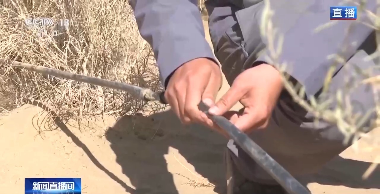 這里的肉蓯蓉能有這樣好的品質,離不開生態林的養護。種植肉蓯蓉的這片防沙林,在三年前還是一片荒漠。在沙漠中,能出現這樣的生命奇跡,得益于當地科學用水。在每一行的梭梭和紅柳的根部都有滴灌帶,因為現在是肉蓯蓉採收季,所以滴灌帶里沒有水。這些滴灌設施,在沙漠里發揮節水灌溉的作用,讓生態林扎根成活,讓肉蓯蓉得以生長。