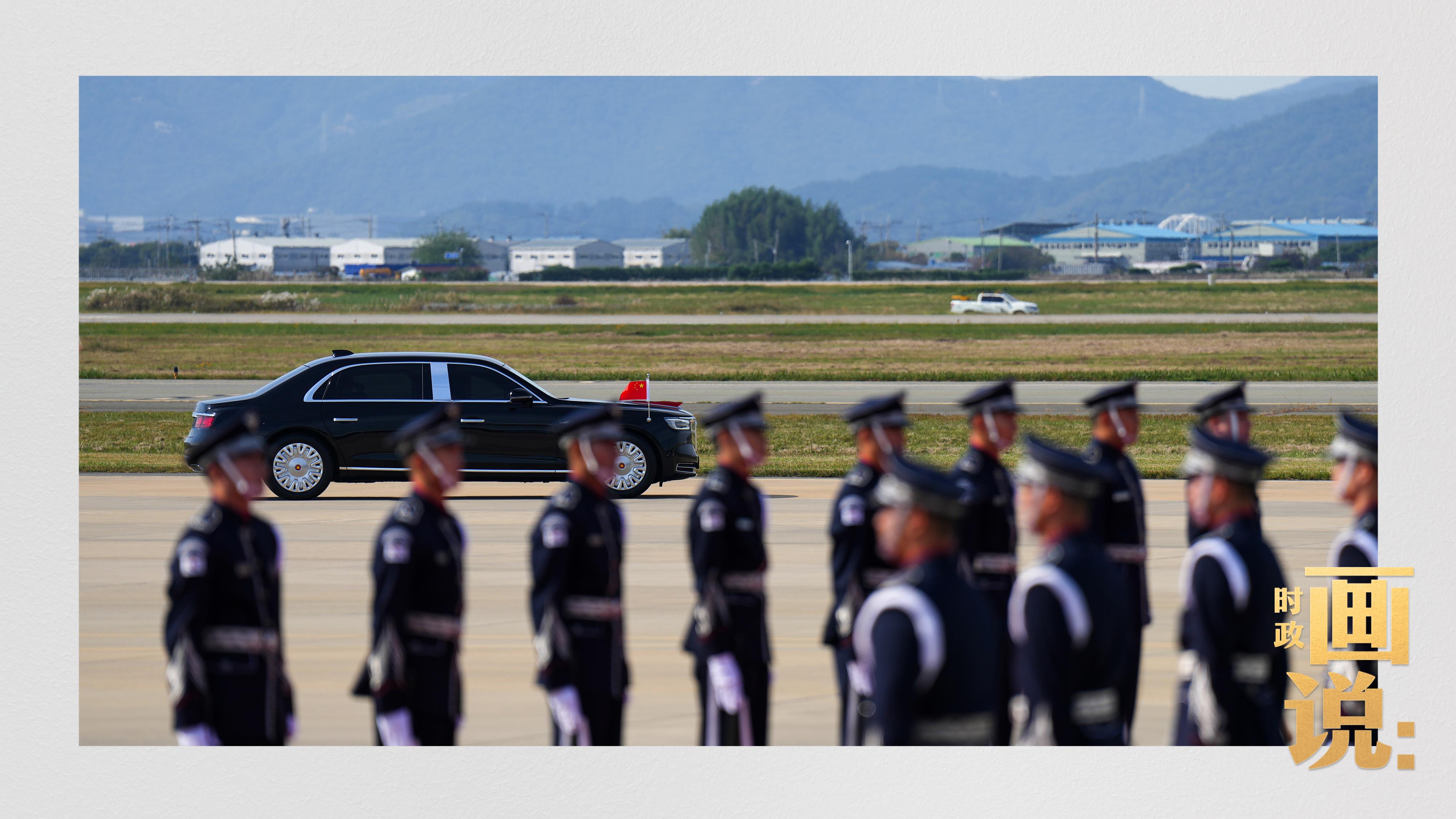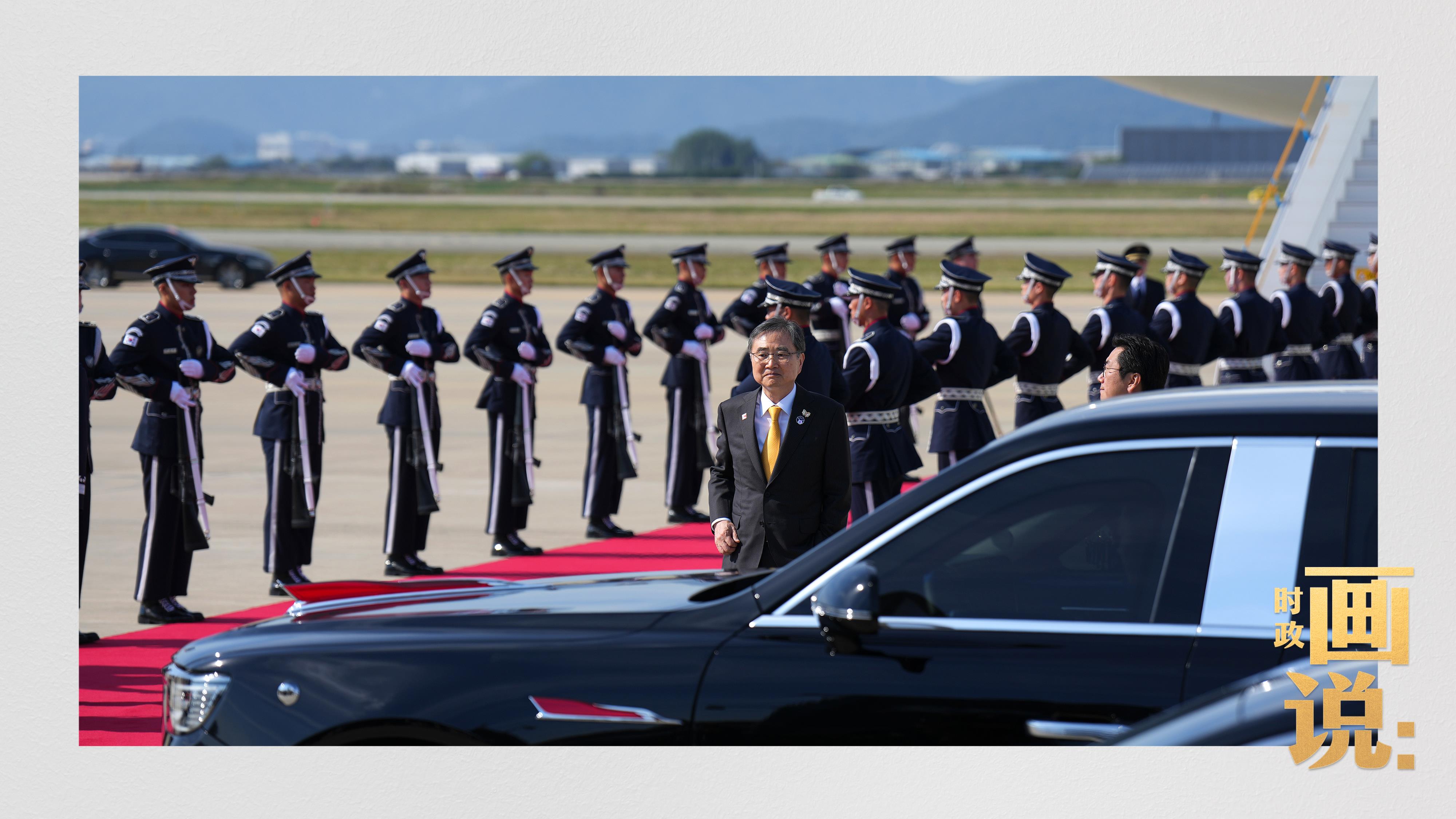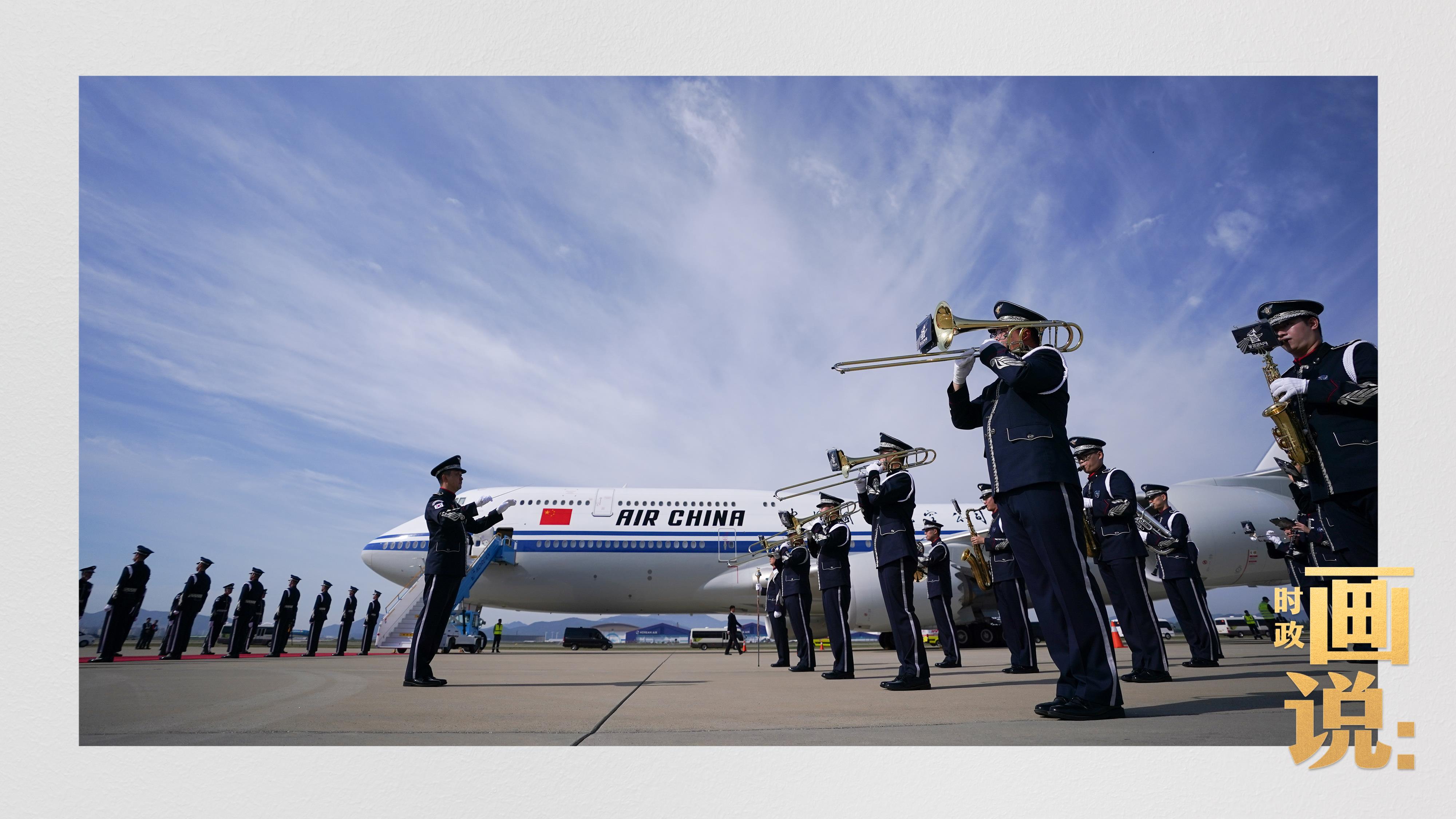 習近平抵達釜山金海國際機場時,韓國外長趙顯等高級官員熱情迎接。禮兵分列紅地毯兩側致敬,軍樂團演奏行進樂,機場鳴放21響禮炮。
