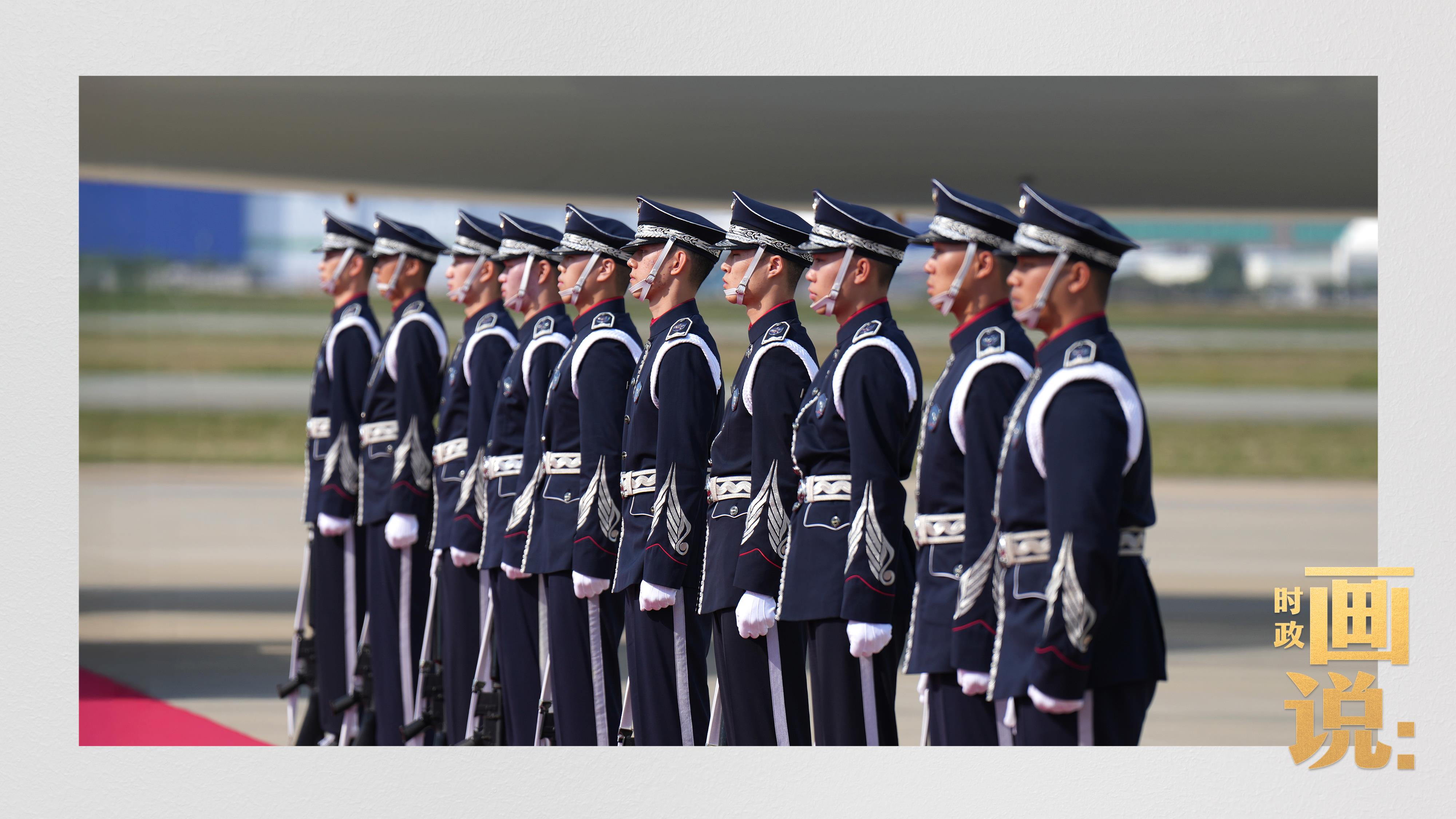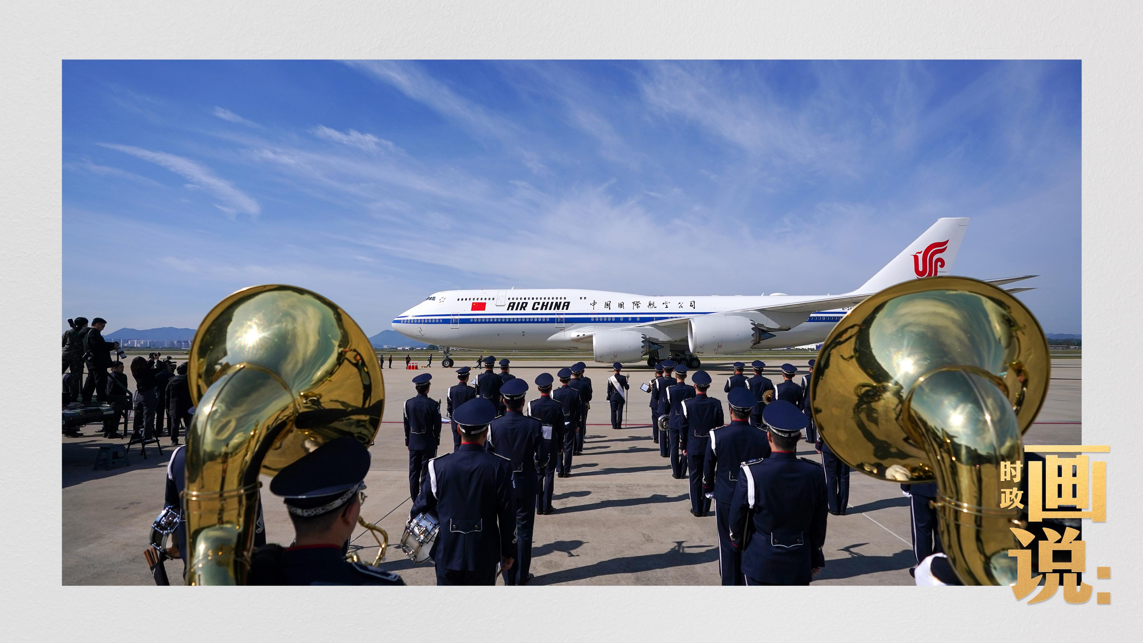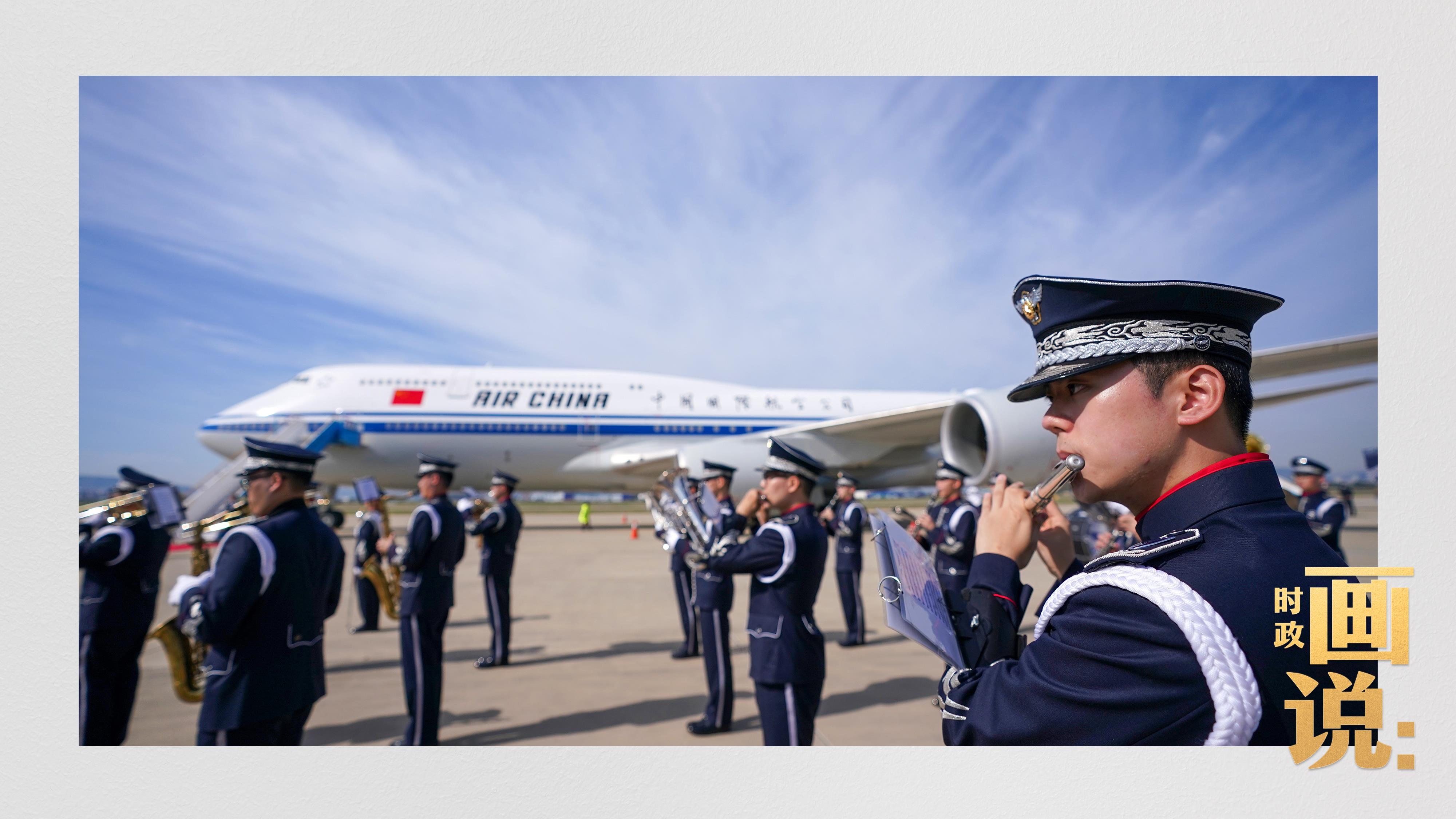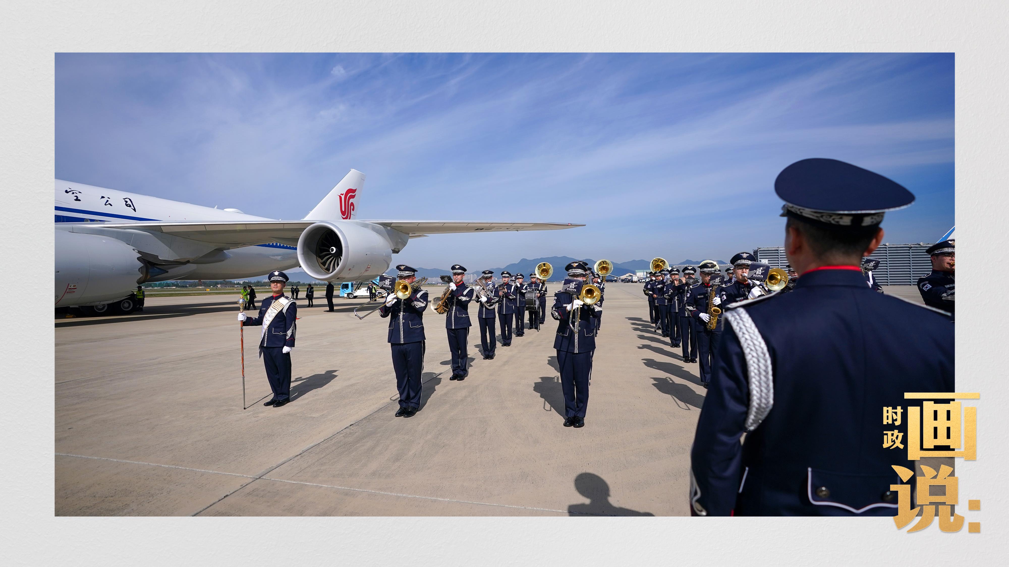 習近平抵達釜山金海國際機場時,韓國外長趙顯等高級官員熱情迎接。禮兵分列紅地毯兩側致敬,軍樂團演奏行進樂,機場鳴放21響禮炮。